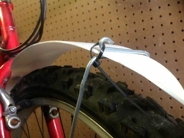 Una vez que averiguar el ángulo recto, es una buena idea hacer un agujero a cada lado de la barra donde golpea el guardabarros: que sería evitar totalmente el deslizamiento. Coloqué la palabra "finalizar" "entre comillas" porque los lazos zip son fáciles de quitar y reemplazar (especialmente si vas con removibles), por lo que no hay nada "final" sobre este proyecto - es fácil de seguir afinando y hacking y trajinando con nuevos diseños.