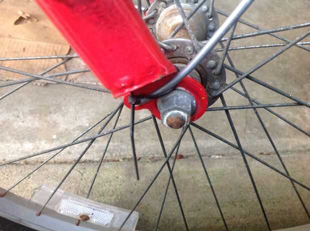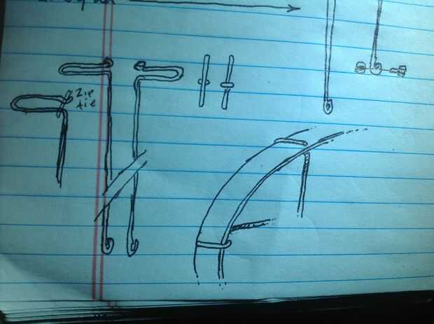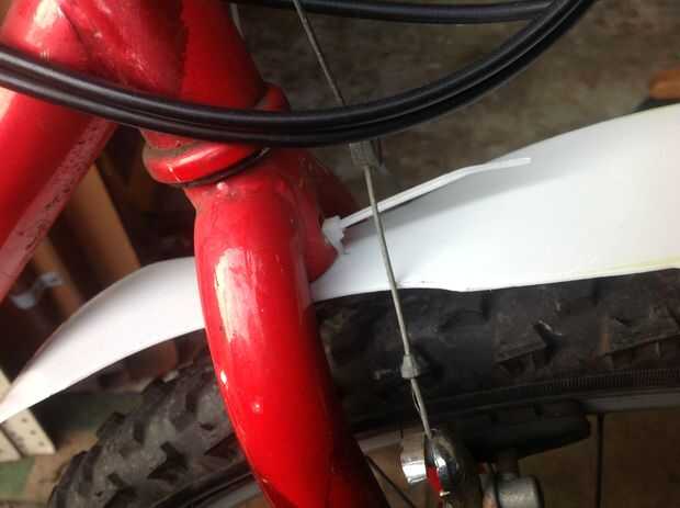 Coloque el extremo doblado de las varillas en los agujeros en el centro, inserte el guardabarros en la ranura de ángulo que realizó en las varillas. Amarra el estrecho punto de la defensa a la mitad de la horquilla, amarra las barras en el centro y amarra el guardabarros en la ranura. Con ataduras de cremallera.