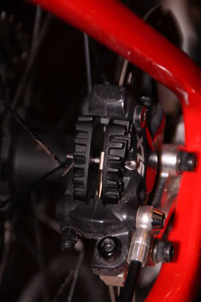 Los frenos de mi bici están Shimano SLX que he añadido los pernos de retención en lugar de pasadores para mantener los cojines en su lugar. usted debe ser capaz de hacer esta modificación en cualquier pinza de freno que utiliza un tornillo central en la retención de pernos para mantener las pastillas.