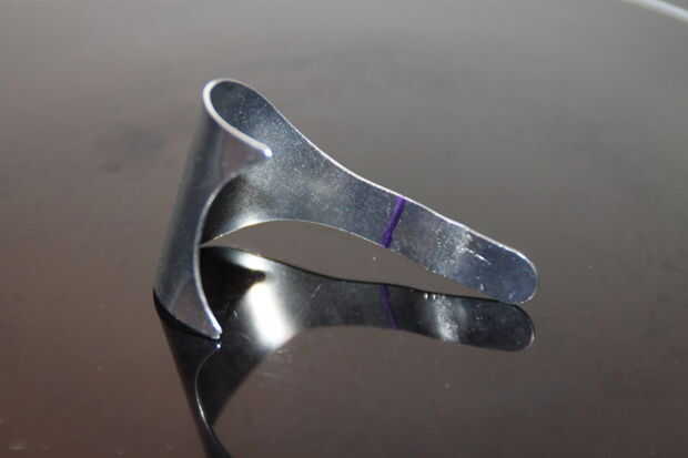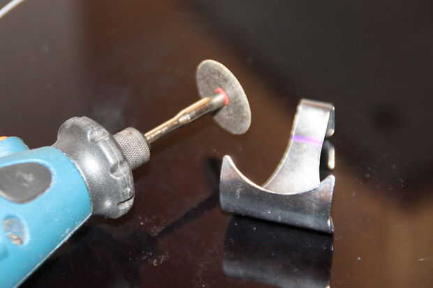 Ponte los guantes y gafas de seguridad y corte la parte inferior del gancho "tab". Compruebe que usted mide correctamente. Utilicé una herramienta rotativa con disco de corte, pero también podría funcionar una sierra para metales. Cortar desde el interior por si acaso me resbalé y marcado el metal - si la marca está en el interior no puede verlo pero un arañazo grande en el exterior molestarme.