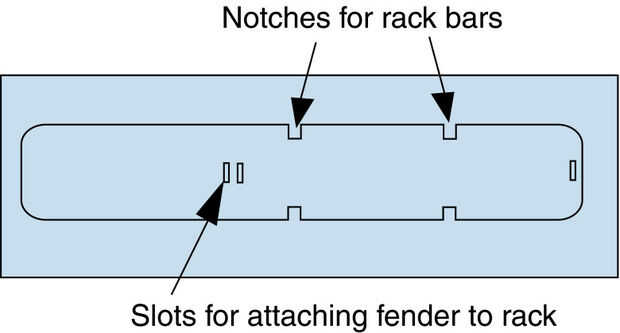 Mi defensa (abajo) incluye algunas muescas en los laterales para la separación de las barras laterales en mi estante de la bici. Mi modelo también incluye un par de ranuras en el centro y una ranura en la parte delantera para permitir la defensa a ser grabado y zip atado a la rejilla. Su patrón puede ser diferente y podría incluir provisión para montaje a un tipo diferente de bastidor trasero, una estructura de apoyo de su propio diseño o puede incluir conchas de lujo y diseños sin razón que no sea estética.