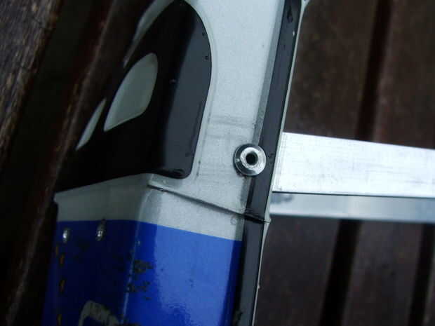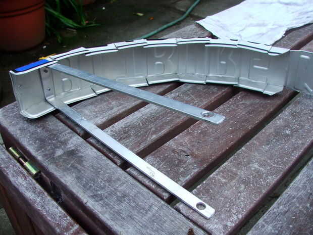 Como se puede ver en las fotos, originalmente iba a conectar la barra de aluminio en la parte inferior. Pero luego me di cuenta de que sería mejor clavar en las paredes de la defensa para que los brazos pueden girar donde usted los necesita sin cambiar la forma de la defensa. Así taladrar los remaches viejos y poner nuevos en los lados.