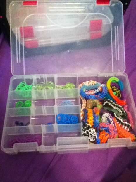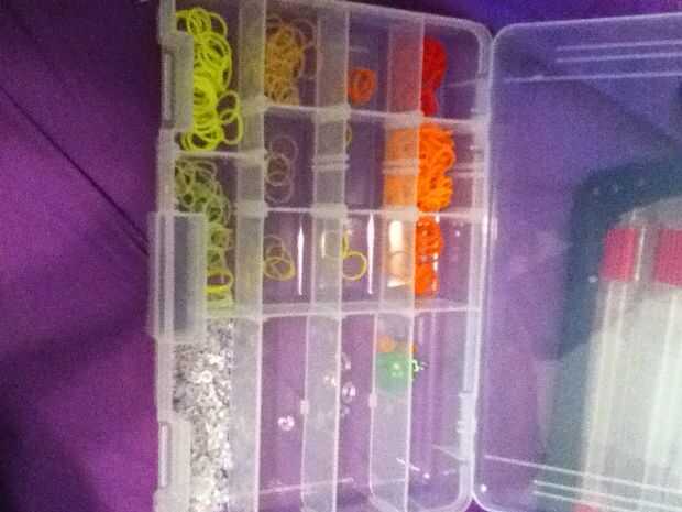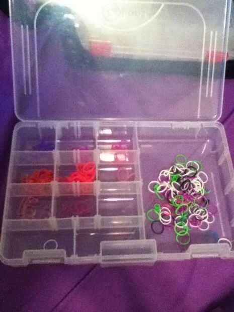 Debe haber 4 cajas, pongo algunas de las piezas para hacer las cajas más pequeñas en el pasado. A continuación os pongo que uno en la parte inferior. En los cuadros más pequeños puse la goma en el orden de rojo, naranja, amarillo, verde, azul, púrpura, rosa, negro y blanco, pero usted puede poner en cualquier orden. En el cuadro superior, en el lado, puse los clips, encantos y granos. En el segundo cuadro, al lado pongo pulseras ya hechos. En el cuadro 3, en el lado, le pongo gomas que soy perezoso para ordenar o planeo hacer una pulsera de ciertos clientes de.