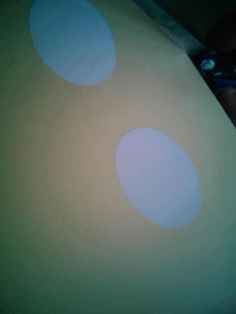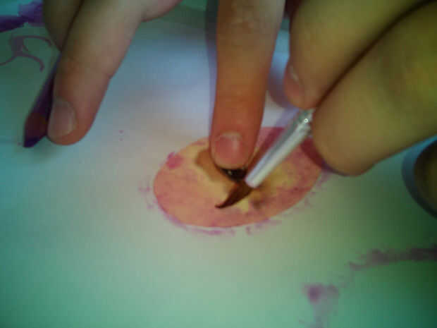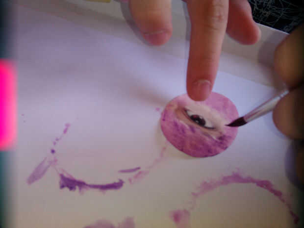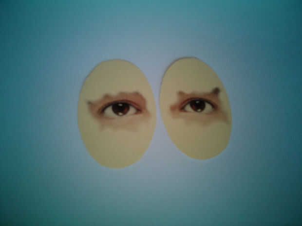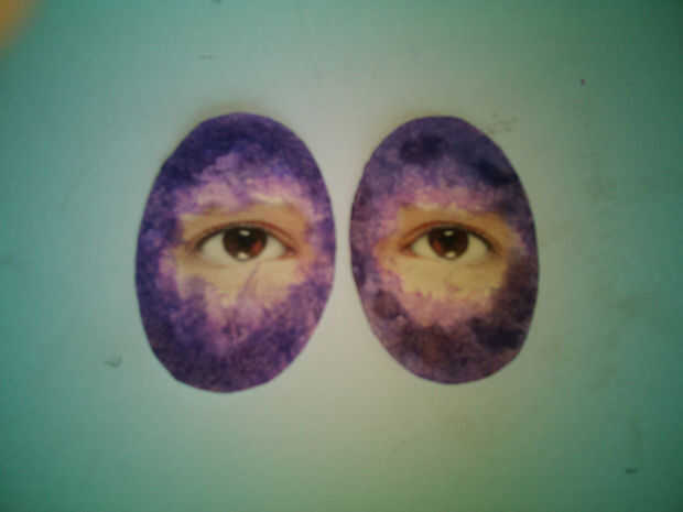 Buscar en línea la imagen que funciona mejor para ya y luego tratar de hacerlos como se muestra en las imágenes de arriba (yo usé pixlr). Luego imprimirlos y cortar en el centro de 2 óvalos similares a los del paso anterior. Además, pintar los óvalos mezclar más colores más oscuros (utilicé acuarela azul violeta, rosado, malva y oscuro pero verdes hará así).