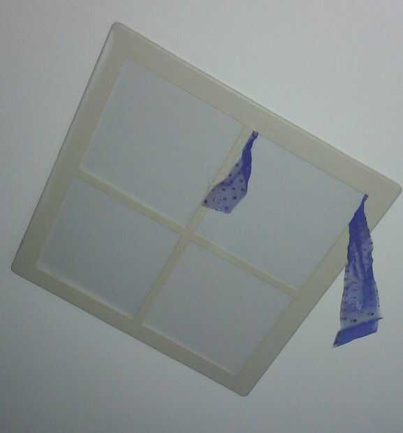 Si le resulta difícil conseguir el cut-out en la posición puede envolver la cinta plana alrededor de él. Esto le da un buen mango que permite bajar el cut-out, y pueden mover la cinta hacia fuera. Usé esto primero en un techo alto ya que era difícil de alcanzar para arriba en el ángulo derecho.