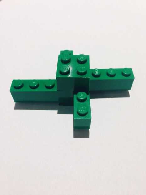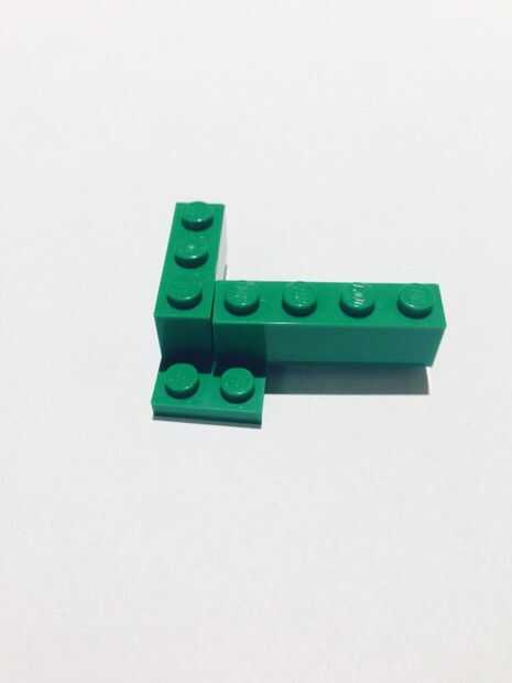 Conecte el lego verde grueso de 2 x 2 en la parte superior y en el centro de los legos de cuatro 3 x 1 como se muestra en la última foto.