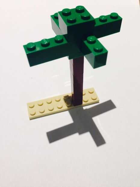 Lugar el juego de lego verde que acaba de crear sobre los varios legos marrón 1 x 1 hasta el final de la palmera.
