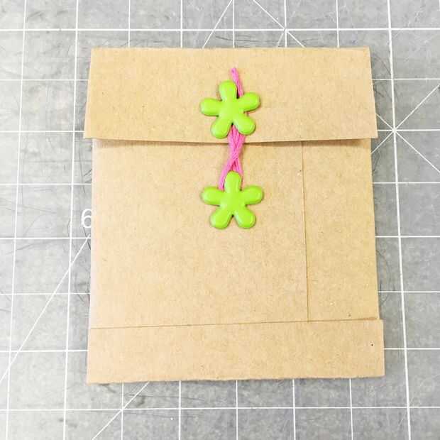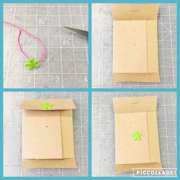 Necesita dos tornillos para cada sobre. Tomar uno de sus sujetadores y ate la cuerda alrededor de ella. Hágale un agujero pequeño en el centro de su aleta superior y deslice el sujetador y seguro. Puede Agregar un poco de pegamento a la cadena para la buena medida.