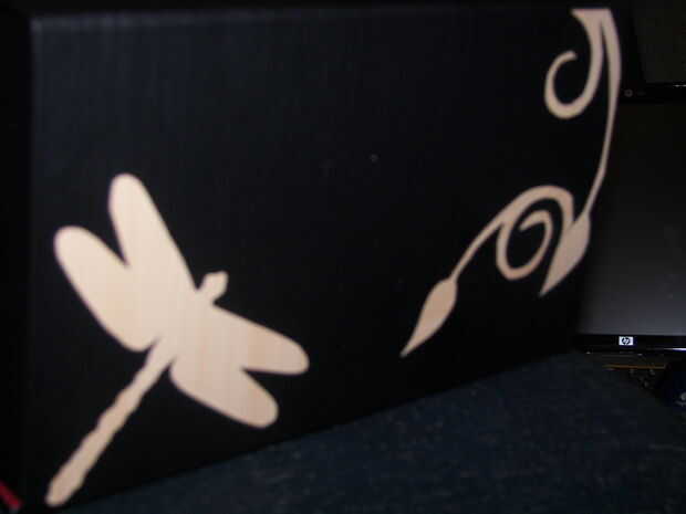 Lamentablemente no tengo fotos de los muebles terminados todavía, así que para darle una idea de cómo funciona, que cubre una caja de galletas con restos de viruta negra acabado y un diseño en acabado de madera ligera. Realmente creo que hubiera visto mejor con un color de fondo más ligero, como madera mediano o una madera rojiza.