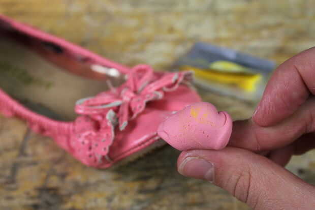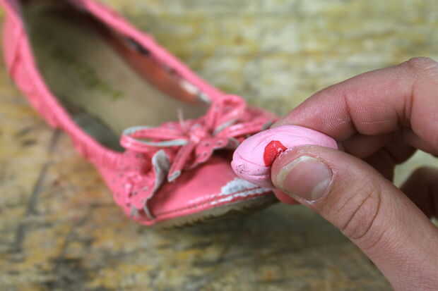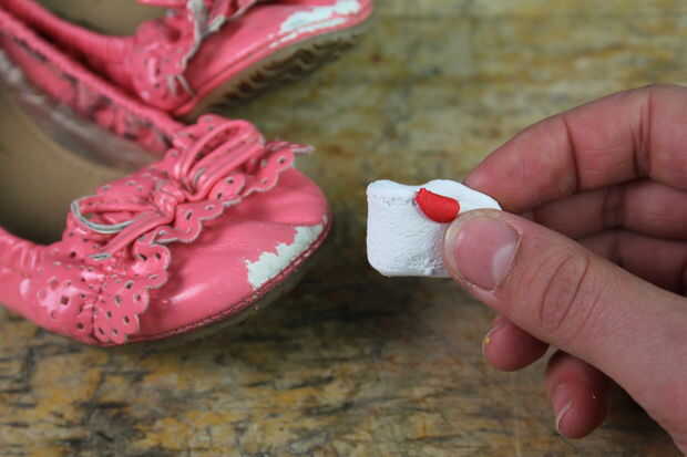 Para el color de mezcla es más fácil comenzar con la más ligera sombra y agregar poco a poco en los colores más oscuros. He comenzado por amasar una pequeña gota de rojo en el blanco y agrega un poco más hasta que se ve similar del color del zapato. Finalmente mezclé en un pequeño pedazo de amarillo - los colores son casi idénticos!
