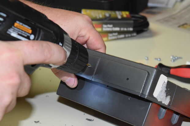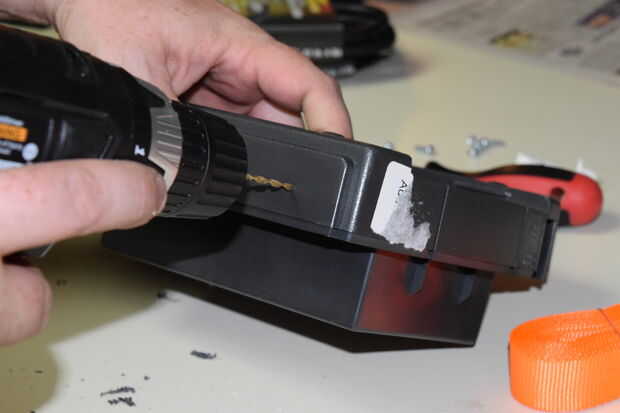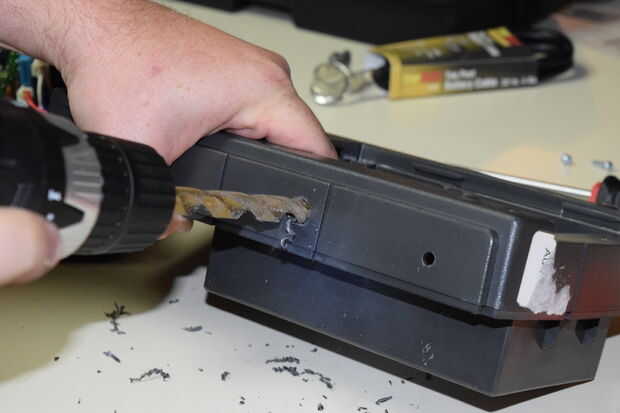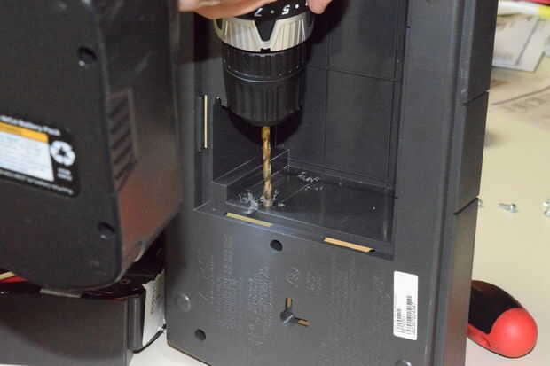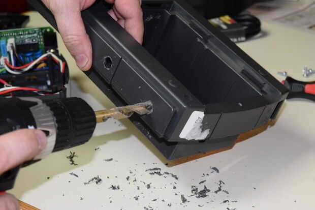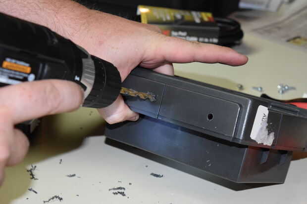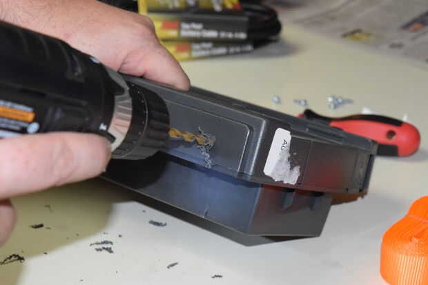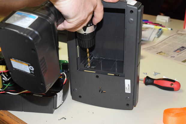 Quitar la pequeña batería interna de la batería y la tapa. Perfore dos agujeros más pequeños a través de la cubierta donde se muestra, estos serán para que los cables de la batería de reserva venir a través de la cubierta. Luego taladre dos orificios más grandes, igual al tamaño de los cables de la batería tienes. Es mejor comenzar con un poco más pequeños y gradualmente incrementar el tamaño del agujero para evitar que la tapa de plástico se agriete.