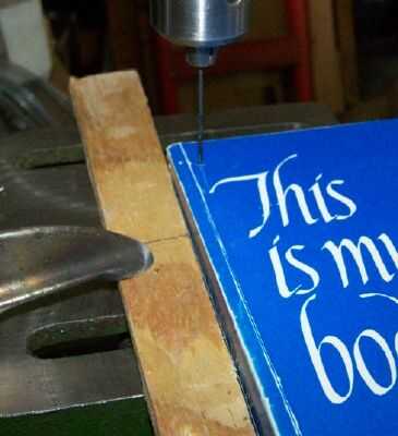Podría haber usado un taladro eléctrico portátil, pero también tenía un taladro disponible. Me tiraron encima de un taladro de 1/16 de pulgada (mi menor) y fijar una valla para guiar la perforación y hacerla uniforme. La portada de este libro también está arrugada. La costura de alambre, se refuerza también.