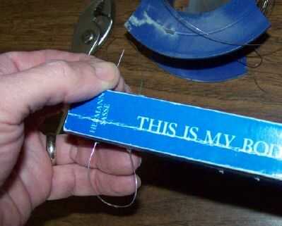 Perforó tres conjuntos de dos agujeros. Estoy usando algún alambre de acero inoxidable fino que alguien me dio. Pase a través de dos de los agujeros. (Este proceso se repetirá para cada conjunto de agujeros).