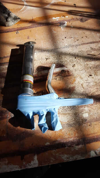 Lo que hice fue poner la punta de la pistola engrasadora en el dedo del guante y estire el guante sobre el extremo de la pistola.