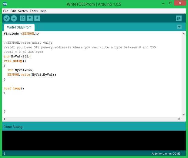 void setup()<br>{ //EEPROM.write(ADDRESS,VALUE);<br>int MyVal=255; EEPROM.write(0,77);<br> EEPROM.write(1,65); EEPROM.write(2,82);<br> EEPROM.write(3,84);<br> EEPROM.write(4,73);<br> EEPROM.write(5,78); }