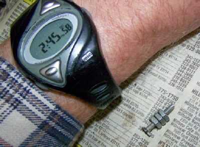 Ya que no fotografío lo que hice como lo hice, recrea el proceso con un tornillo de 6 x 32 comun y demostrará aquí.  Las tres tuercas del tornillo demuestran que es recto y los hilos de rosca funcionen correctamente.  Incluí mi reloj para afirmar que no simplemente tomé antes y después de las fotos de este tornillo solo segundos aparte.  El tornillo original de la escopeta parece ser un poco más grande que un tornillo del #8.