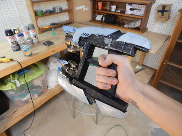 esto es arma de ciencia ficción de la prop. Este se compone de1. Forex (cartulina como material).2. plásticos tapas.3. tubo de aluminio como barril.4. cuadrado tubo metálico como titular/carrier(which is welded in L-shape inside & fixed in a ply-wood