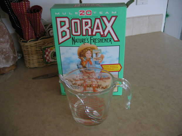 Tomar aproximadamente 4 cucharadas de bórax o bicarbonato de soda y mezclar bien en la media taza de agua caliente