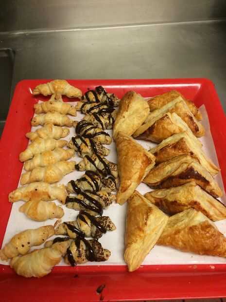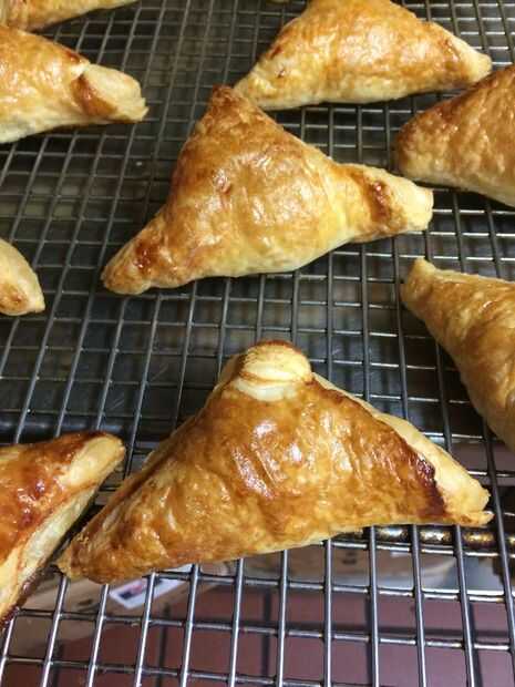Hacer que encaja en la bandeja para hornear alineando los triángulos para arriba detrás en cuadrados sueltos, si no tienes un recipiente lo suficientemente grande o utilizar recipiente 2, manteniendo las piezas aparte por lo menos 1/2 pulgada, no este hojaldre de cosas para nada, aquí yo sólo alineados les porque utilizamos sartenes gigantes en un horno comercial ,