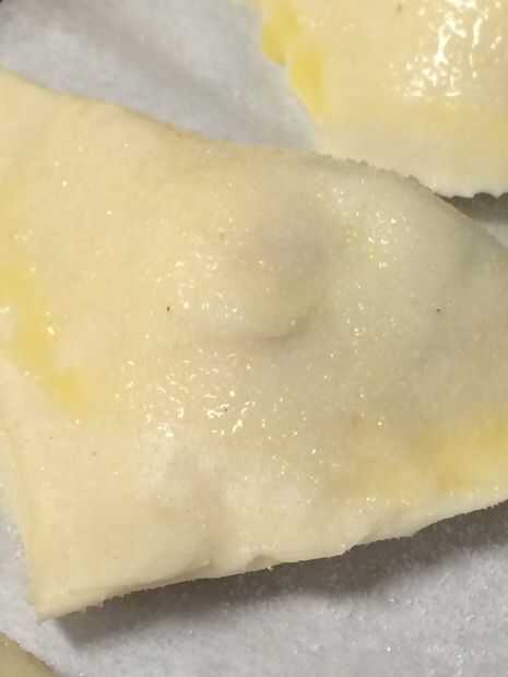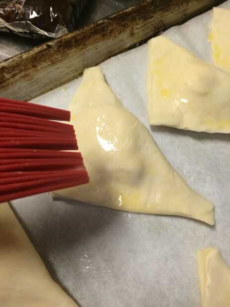 una vez que los transfiere a su hoja de cocción ligeramente cepille cada triángulo con el lavado de huevo y rociar las tapas con el azúcar, no demasiada azúcar, usted puede apenas ver en las fotos, se licua al instante, azúcar de mesa se quema mucho más rápido que el azúcar de gránulos grandes (cristal) ver en productos comercialmente horneados ,