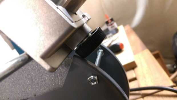 Deslice la barra a través de las dos ranuras. Caben dos tornillos en las ranuras para dejar la barra de desplazamiento hacia arriba y hacia abajo en las ranuras. desea que la barra lo más lejos de la disco como sea posible.