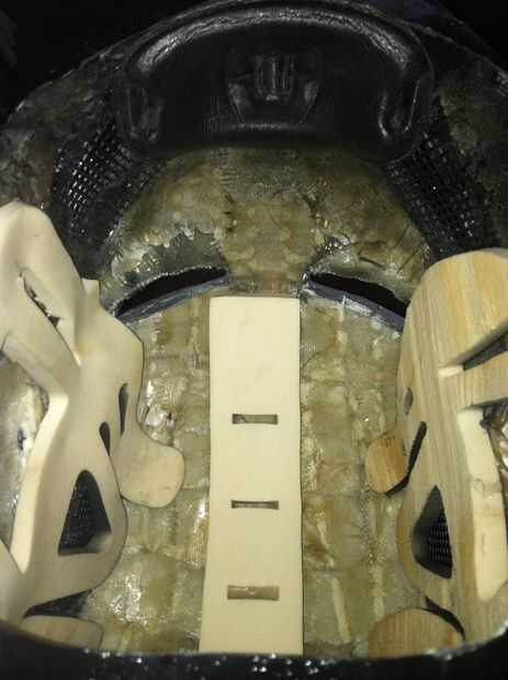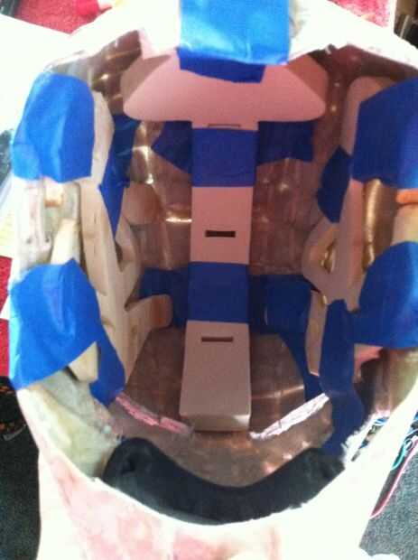 Una vez que el relleno, debe cortar a la derecha formas y tamaños que obviamente determinado por la forma y el tamaño de su casco. Cuando eso se hace, solo cinta las piezas para ver si encaja bien y luego cuando se cortan las piezas a montar, pegar en. Asegúrese de utilizar un pegamento mucho porque colocar y quitar el casco en la cabeza se puso el desgaste en su casco y afloje el relleno con el tiempo.