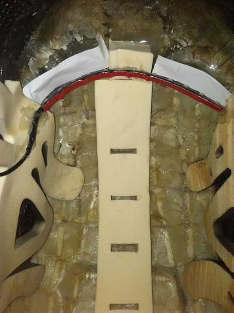 En primer lugar usted quiere cortar dos pequeños pedazos de papel para opacar la luz apagada de los ojos para no sólo parecen LEDs llano que se vería mal. Una vez que se cortan las piezas, pegamento caliente dentro del casco sobre los ojos como usted ver en la imagen. Debe dejar una abertura en la parte superior del papel por lo que se puede ver todavía brevemente de los ojos; ver la tercera foto para ayuda.