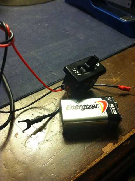 Una vez hecho este paso, puede conectar las luces a la batería y el interruptor. Si tienes un interruptor, simplemente tira de la extremidad de los cables y conectarlos a los puertos correspondientes en el interruptor. Además, vas a conectar los conectores positivo y negativo de la batería al interruptor, así. Si los conectores y los cables son rojo y negro, asegúrese de poner los mismos colores con los demás. Cuando eso se hace, enganche el otro extremo del conector negro a la parte más grande de la batería de 9 voltios y la clavija roja a la otra parte de la batería. Llevar el interruptor a y debe tener todo listo!