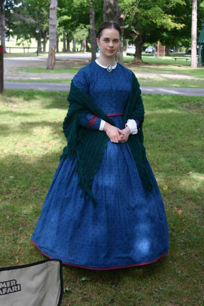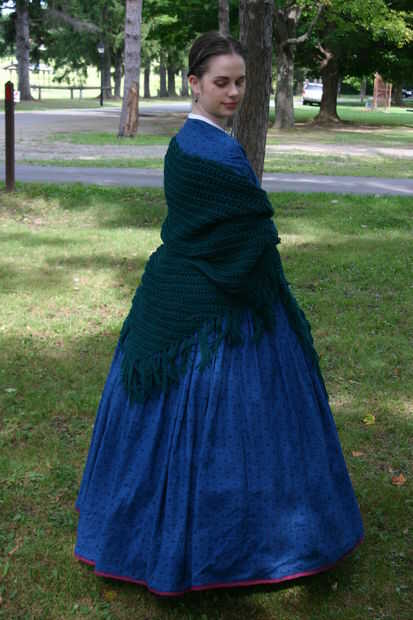 pertenezco a una unidad reenacting de Guerra Civil que se enorgullece de autenticidad. Me gusta tejer artículos para mí y otros recreadores en eventos. (Hace para fotos grandes oportunidades!) Uno de mis compañeros recreadores quería a crochet un chal para usar el más auténtico posible de medios. Tomé eso como un permiso para salir y comprar el hilo más glorioso, caro que pude encontrar! Aquí está una foto de mí con el producto terminado. Es un chal verde de ganchillo de lana 100% con una puntada de crochet doble un flequillo y una puntada para rematar la parte superior de