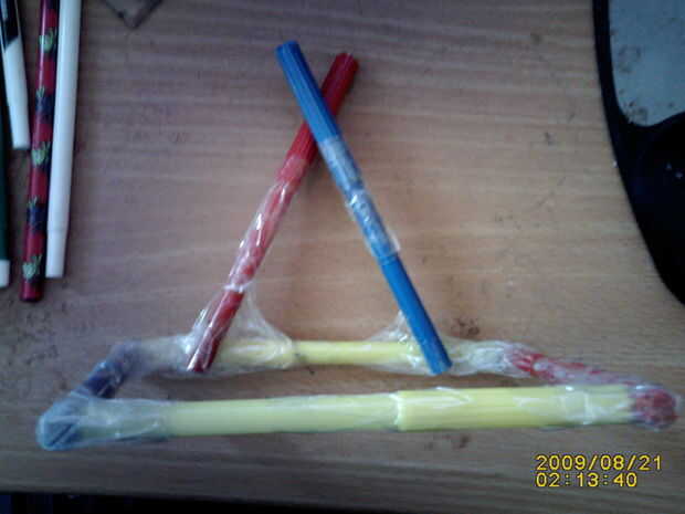 He usado lápices de colores para hacerlo más fácil de ver. Las plumas amarillas son como los lados, y el lápiz rojo (en la base) es el frente. Lugar un restante azul pluma cerca del bolígrafo rojo (base) y celotape en su lugar. He hecho en aproximadamente un ángulo de 75 grados, no es necesario estar en, pero ayudará a algo parecido a esto. Ahora lugar un restante rojo pluma azul pluma (base) y celotape en su lugar, esta pluma es aproximadamente un ángulo de 65 grados.