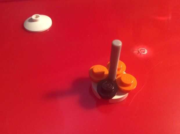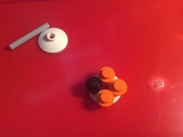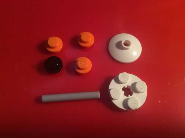 Para hacer la cabeza del BB-8, coloque tres postes naranja y un montante negro ontop de una placa circular blanca de 2 x 2. Luego, se pegan un palo gris por el agujero de la placa de 2 x 2. Para acabar, tomar un plato de satélite blanco y cubrir la cabeza.