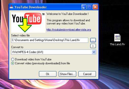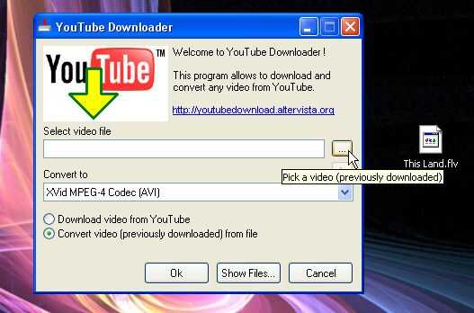 En la interfaz, hay dos burbujas de verificación; al iniciar el programa, debe llenar el que dice "Descargar video de YouTube". Vea el otro ("convertir video del archivo") - la interfaz debe cambiar un poco. Haga clic en el cuadro con los puntos suspensivos (...) en él y seleccione el archivo-a-ser-convertido.