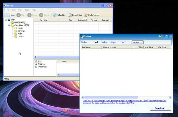 Hay dos partes en el aparato de la descarga: el organizador de la órbita, que hace la descarga y en la que ves el progreso y Grab ++. Grab ++ es el cerebro de la instalación (lo que significa que hace algo especializada y hojas el grunt trabajo a otro), y las capturas jugando los medios de comunicación; el organizador hace la descarga real. Hay tres maneras de obtener los medios de comunicación con órbita, cada una de ellas tiene sus usos.