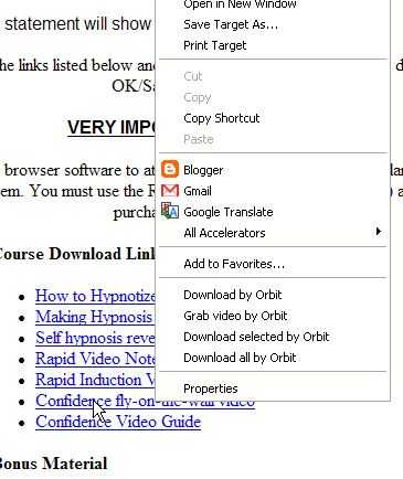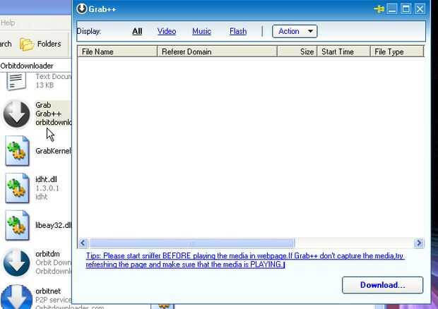 El botón de agarrar que es método dos. Cuando primero instalar órbita, debe habilitarse el botón, pero puede volver a encender y a través del organizador (puede ser tipo de molesto cuando no quiere capturar algo). Cuando está activado, pase el cursor sobre un video, un archivo SWF, o música, aunque esta última opción es mucho más difícil porque en la mayoría de los sitios es música a través de un reproductor (que generalmente es un archivo SWF, use Grab ++ de la lista, que encuentra el SWF y el Mp3 juego).