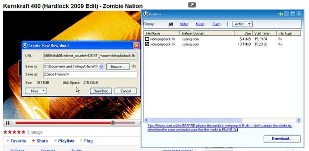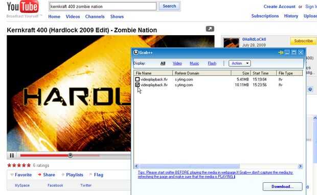 Pasando, el primer método de captura es usar Grab ++, que puede empezar desde una carpeta o desde el botón de herramientas en el organizador. Una vez iniciado, gancho agarrador vigilará tu navegador para música, vídeos y objetos Flash. Cuando se detecta uno, gancho agarrador agregará los medios de comunicación a la lista de visualización, donde muestran el nombre de archivo, sitio y tipo de archivo. Éstos se enumeran en orden de aparición, así que preste atención, o se puede descargar la cosa equivocada.