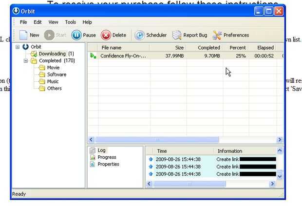 La tercera opción sólo está disponible si la órbita está instalada en su computadora (a diferencia de llevar los archivos en una unidad flash). Básicamente es sólo una versión más rápida del Internet Explorer, FireFox, etc, descargar. Haga clic en cualquier archivo en la web y haga clic en que el enlace de descarga de la página web o uso Guardar destino como y el cuadro de descarga de la órbita aparecerá. Puede hacer clic en cancelar y descargar utilizando el método por defecto, pero es generalmente más rápido (aunque yo no pude hacer que funcione con cromo). Nuevo, introduzca un nombre de archivo y esperar el cuadro completo de descarga.
