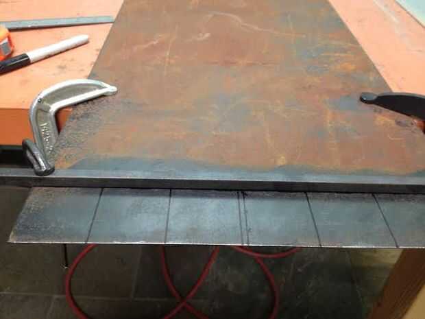 Al cortar longitudes extendidas de la chapa es una buena idea de utilizar a algún tipo de guía para asegurar un corte recto. Decidí usar un pedazo largo de Plaza bar stock para ayudarme a mantener mi corte primero y más importante. Después de que acabo de hacer mi mejor esfuerzo para seguir mis líneas escriba y afortunadamente resultó bien. Para cada corte debe sujetar la pieza de trabajo hacia abajo para que no ir a cualquier parte una vez que usted comience a cortar.