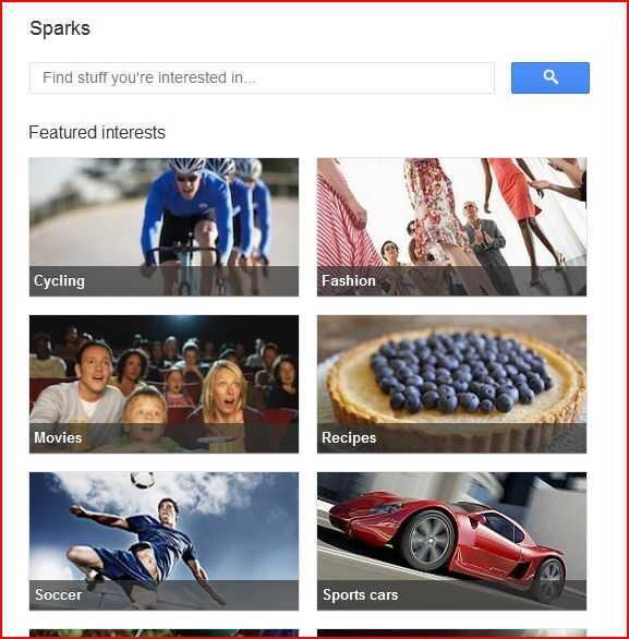 "Chispas" es una característica que permite realizar búsquedas de temas interesantes que te interesa de en toda la web. Digamos que estás aprendiendo a hacer malabares. Pueden buscar "malabares" y luego agregarlo como un interés por lo que puede estar siempre al día en el mundo de la manipulación de objetos. Y si te cansas de la gente que te llama un payaso todo el tiempo, se puede quitar ese interés. Para agregar intereses en chispas para seguir las últimas historias que le interesan más, buscar algo. Busca en chispas, haga clic en "Añadir interés". Usted puede acceder rápidamente a sus intereses haciendo clic en el nombre de interés bajo el enlace de las chispas. No te preocupes, los intereses que se añaden chispas se mantienen en privado. ¿No está interesado en algo más? No se preocupe. Es fácil quitar un interés en chispas. Debajo el enlace de chispas, mueva el ratón sobre el interés que desea quitar y haga clic en la "X".