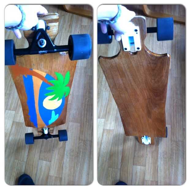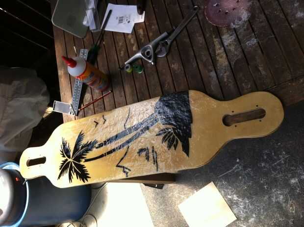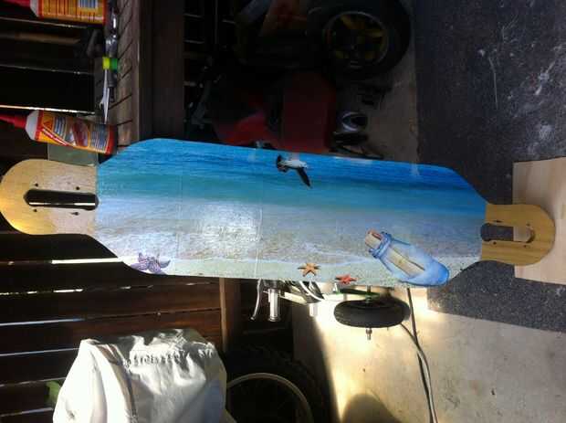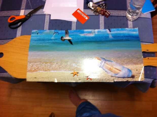 La escena de la playa que compré fue dividida en cuadrados de 15 x 15 cm así que corte cada uno y aplica cada pegatinas a la Junta por separado. A continuación os pongo unas cuantas capas de barniz a sello los bordes.