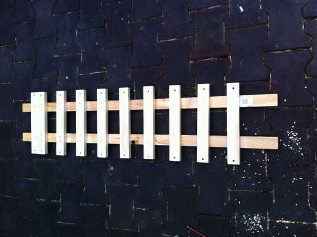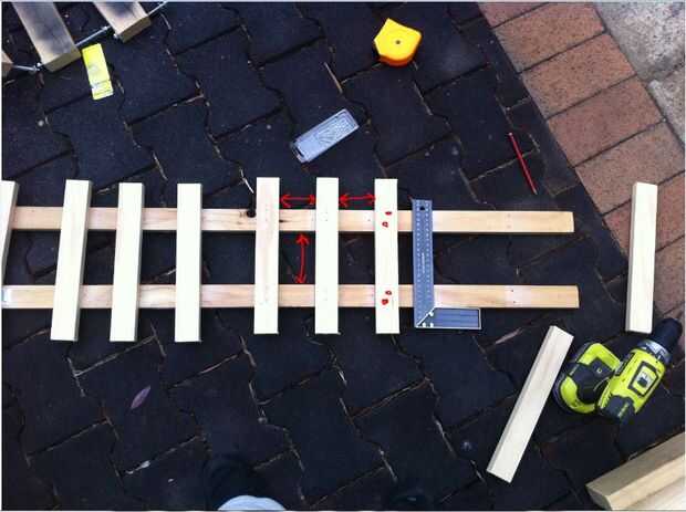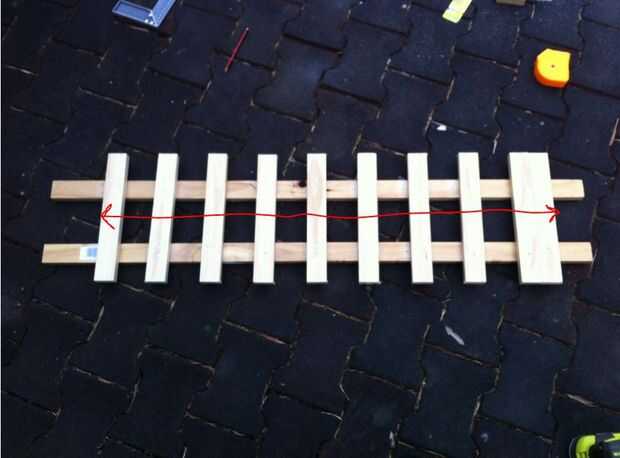 Para construir el prensa marco Inicio encontrando el centro de ambos carriles principales, tornillo de la costilla de centro a la mitad dejando 5cm a cada lado de los carriles del centro. Tornillo 2 tornillos de madera en cada carril principal (es decir, 4 tornillos por costilla).