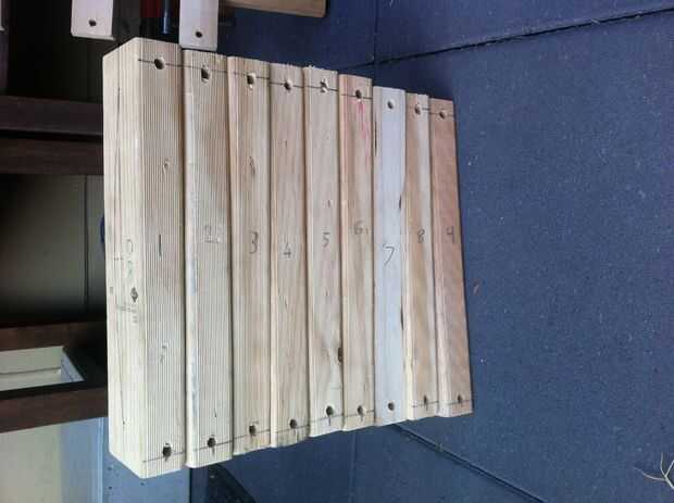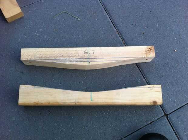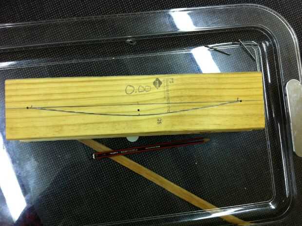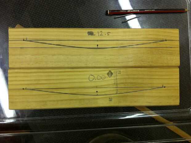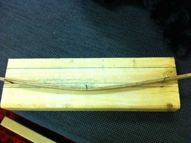 Para incorporar una 1/2" cóncavo en el tablero usé tres clavos. Comience clavando la mitad en 2 clavos de 30mm de los extremos. Encontrar el centro de la costilla y medir 12,5 mm hacia abajo y ponga otro clavo. Alcanzar la curva simétrica doblando una regla alrededor de las uñas, tercera foto.