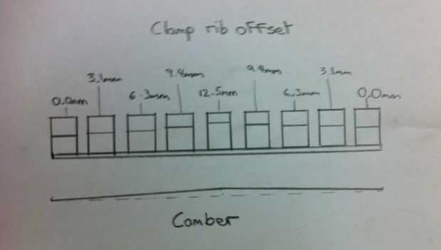Incorporar 1/2" inclinación las costillas finales proceden de la línea central y tienen la altura de 0.0mm mientras que la costilla de centro se dibuja encima de la línea de centro que da a la Junta un peralte de 1/2" 12.5mm. Las costillas desde el exterior en subida lenta para cumplir con la costilla de centro. Cada costilla se dibuja 3,1 mm superior a 12,5 mm. Ver la segunda imagen.