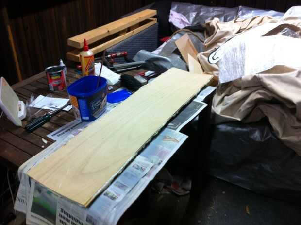 Deja al menos 6 horas antes de tomar el Consejo de la prensa. Una vez seca la cubierta, mezclar 250ml de resina de fibra de vidrio y catalizador recomendado (ver instrucciones). Vierta la mitad de la mezcla en la parte superior de la Junta y extender con un pincel. Una vez que se cubre totalmente la parte superior Coloque la hoja de fibra de vidrio en parte superior y dab hacia abajo con el cepillo. Lentamente añadir la otra mitad de la mezcla de resina en la parte superior de la Junta, no utiliza trazos de pincel para extender la resina (esto va a arruinar la fibra de vidrio). Dab en cambio la fibra de vidrio. Asegúrese de que la fibra de vidrio en el tablero llega a estar claro que significa curará correctamente (ver segunda foto). El Consejo está ahora listo para forma.