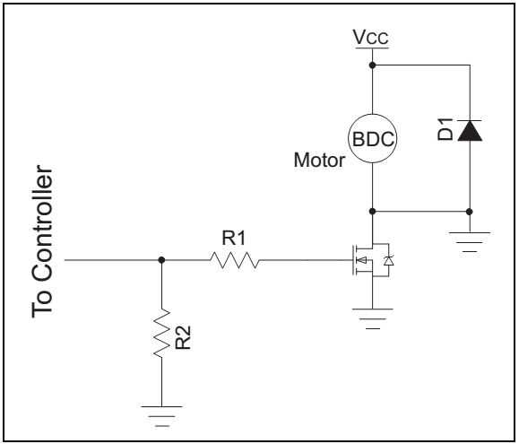 Tenga en cuenta que en el circuito hay un diodo en el motor. Este diodo está ahí para evitar que el nuevo grupo netic flujo (FEM) voltaje dañe el MOSFET. FEM se genera cuando el motor está girando. Cuando el MOSFET está apagado, el bobinado del motor todavía se cobra en este momento y produce flujo de corriente inversa. D1 debe ser clasificado apropiadamente para que se disipe esta corriente.