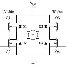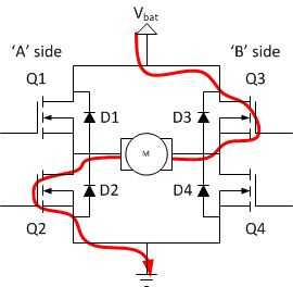 Para entender esto, el puente H debe ser roto en sus dos lados, o mitad-puentes. Refiriéndose a Q1 y Q2 forman puente de media mientras que Q3 y Q4 forman la otra mitad-puente.