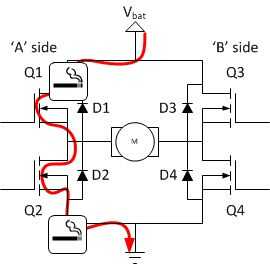En un puente, debe cerrar nunca tanto Q1 como Q2 (o Q3 y Q4) al mismo tiempo. Si lo hiciste, sólo han creado un camino de muy baja resistencia entre el poder y la tierra, efectivamente un cortocircuito entre el suministro de energía. Esta condición se llama 'shoot-through' y es una forma casi garantizada para destruir rápidamente el puente, o algo más en tu circuito.