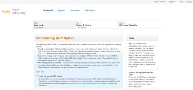 Amazon te ofrece para optar a un programa llamado PDK seleccione. Optando en KDP seleccione limitará su trabajo a sólo el Kindle de Amazon, a diferencia de cualquier otra forma de acceso a Amazon, como su sitio Web. Sin embargo, añadir algunos beneficios que se enumeran en la caja grande de azul que ves arriba. Personalmente opté de KDP selecciona, ya no me importaba mucho para que los beneficios, mi contenido todavía va a llegar dispositivos Kindle cueste lo que cueste.
