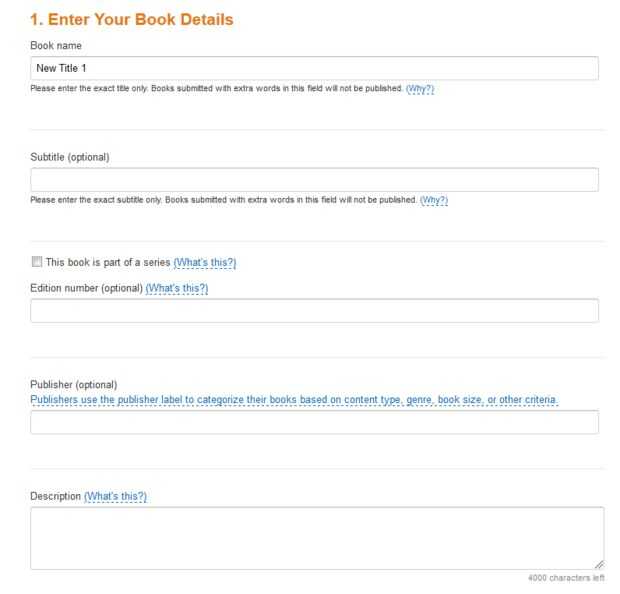 Avanzando, la siguiente sección solicita toda la información básica sobre el libro que debe ser establecido ya. Título es auto explicativo y si eres como yo, tenía su corazón en una antes de siquiera empezar el libro. Subtítulo es generalmente para los libros de una serie que tienen otro título, tales como; Harry Potter y la piedra de brujo, o Percy Jackson, el ladrón del rayo. Puede marcar este libro como parte de una serie, y si lo haces tienes que indicar que es el volumen y el título de la serie. Para la descripción, incluir cualquier información que pondría en la parte posterior de un libro de tinta y papel.