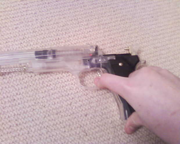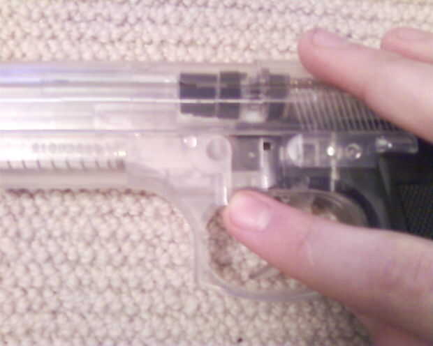 1) flick el swith en el lado izquierdo de la pistola (frente a la seguridad) hacia abajo