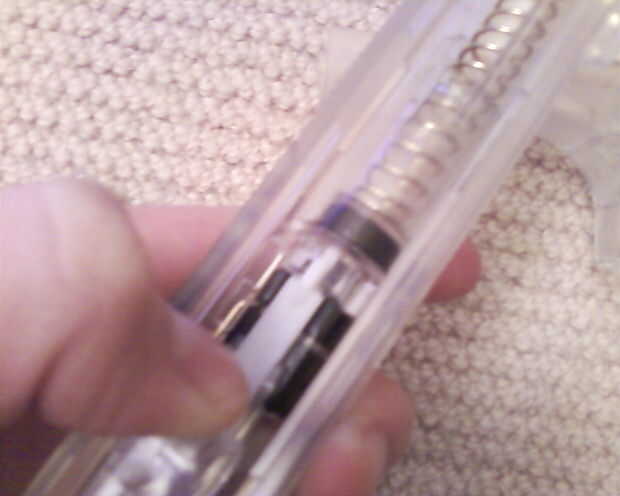 3) Voltee la parte superior de la pistola y tire de la primavera, luego tire la pequeña puerta blanca. Si un BB es atascado, será allí.